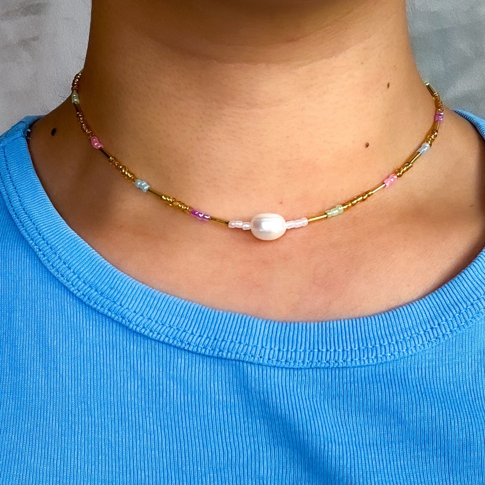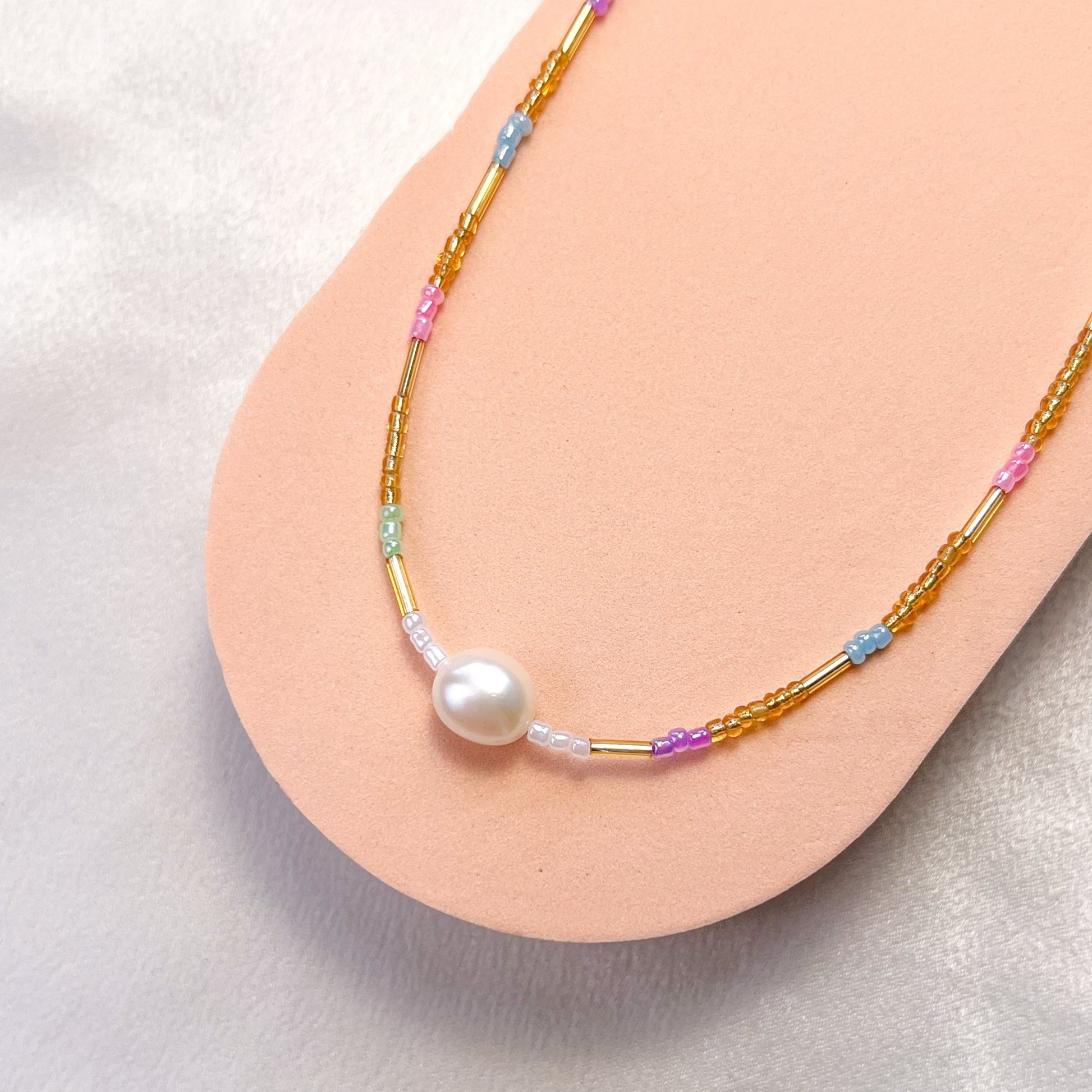 Handmade in Malaysia beaded pastel colourful necklace with real freshwater pearl. Unique and handmade. Easily self adjustable necklace for all lengths eg choker necklace or necklace stacking